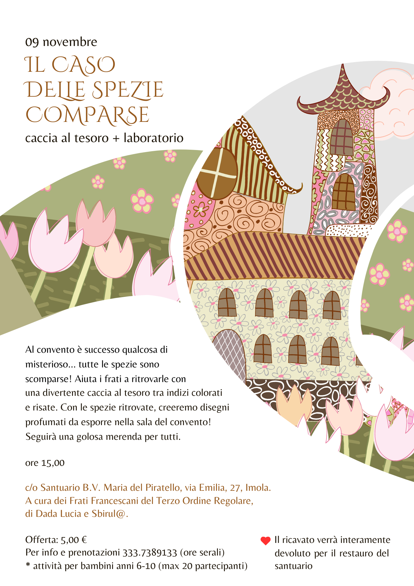 Qualcosa di strano sta succedendo al convento della Beata Vergine Maria del Piratello… tutte le spezie sono scomparse! I frati non riescono più a trovarle, e senza il loro potere il grande disegno profumato non potrà essere completato. Serve l’aiuto di piccoli esploratori coraggiosi! Inizia così una caccia al tesoro piena di indizi, enigmi e profumi misteriosi: i bambini, insieme alle loro mamme, scopriranno una spezia alla volta, seguendo tracce nascoste tra i segreti del convento. Con le spezie ritrovate e i colori naturali i piccoli artisti creeranno variopinti disegni, che verranno esposti nella sala del convento e ammirati come veri capolavori! Un’avventura tra mistero, risate, pennellate e alla fine... una golosa merenda per tutti!